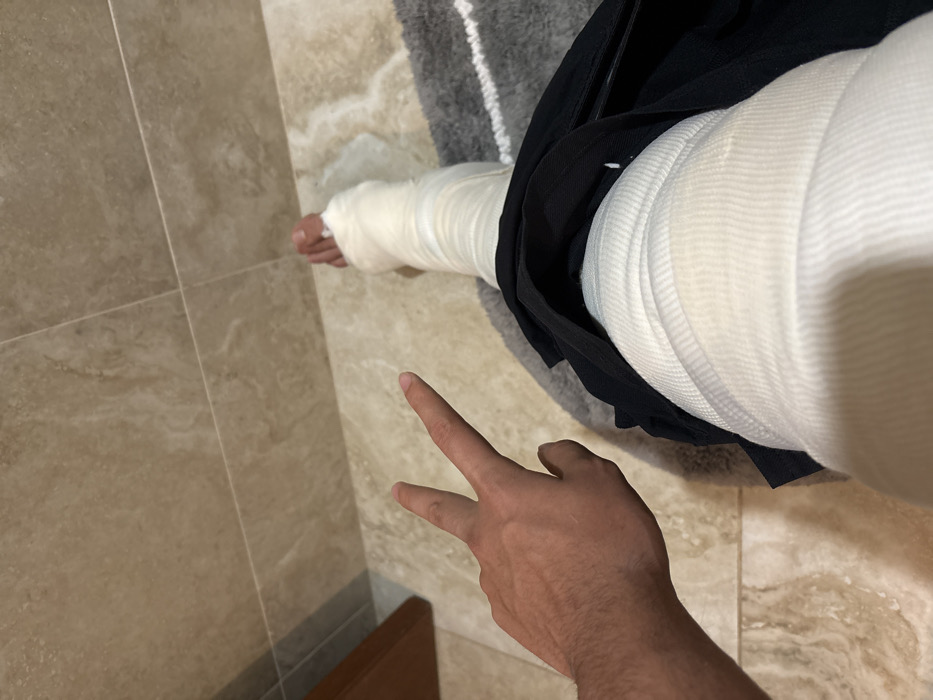 A bandaged right leg extends from the knee down to the toes. The leg is wrapped tightly in white material. A black fabric covers part of the leg above the knee. A hand is positioned in the foreground, making a "peace" sign with two fingers. The background consists of tile flooring on the left and a rug on the upper right. A small portion of a wooden object is visible in the lower left corner.