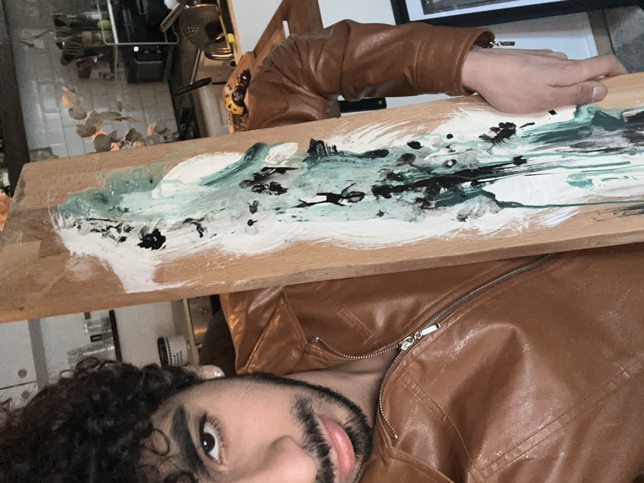 An indoor scene, likely a kitchen located in Palaiseau, France, presents a male subject holding a rectangular wooden board featuring abstract painting. The male, positioned in the foreground and visible from the chest up, has dark, curly hair, a beard, and a mustache, with a stud earring in his left ear. He wears a light brown leather jacket with a partially unzipped silver front. He looks directly at the viewer. The wooden board, held vertically by the subject's left hand, displays abstract art rendered in white, teal-green, and black paint, characterized by broad strokes, drips, and splatters. The background consists of a kitchen environment: shelves stocked with various containers, a white tiled backsplash, a metallic utensil rack, a light-colored countertop, and a yellow and black ladybug ornament. Portions of a stainless steel appliance and a framed item are also visible.