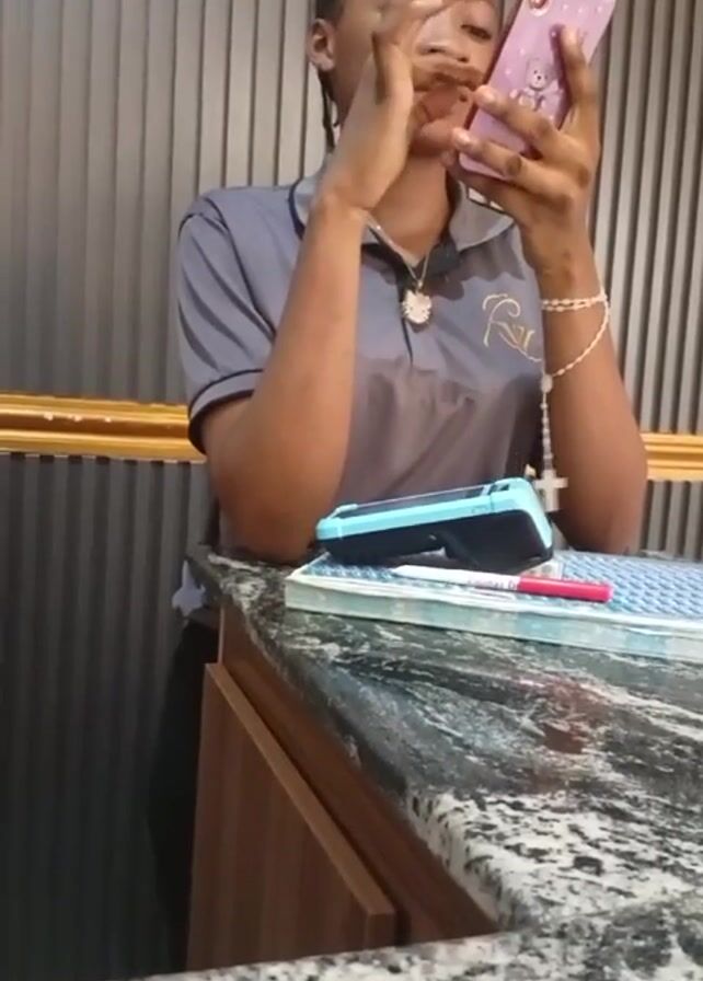 A young African woman stands behind a counter and uses a pink cellphone. She's wearing a gray polo shirt with a small gold-colored emblem on the left side, and a beaded bracelet on her right wrist. She has dark hair pulled back in thin braids. On the countertop in front of her are a blue credit card reader, a notebook, and a red pen. The countertop has a black and white marble pattern. The wall behind the woman is gray and features gold trim near the top. The woman appears to be typing or looking at something on her phone screen.