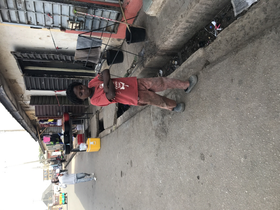This daytime scene in Jos, Nigeria, depicts a bustling street with commercial activity and pedestrians. In the foreground, a young Black child stands on a concrete sidewalk edge, positioned left of center. The child wears a red t-shirt with "Christian School" printed on it, stained light brown pants, and grey clogs. Their arms are crossed, and their gaze is directed towards the left with a solemn expression. To the child's right, a concrete drainage ditch filled with debris runs parallel to the sidewalk. Along the right side of the street, a row of single-story commercial buildings features corrugated metal roofs and security-shuttered windows and doors. In the mid-ground, a makeshift street vendor stall with a metal frame displays various items, including multiple black bowls, a red bowl, and a yellow cooler. Adjacent to a building, a metal clothes rack holds two towels, and two black plastic buckets are placed on the ground. On the paved asphalt road in the mid-ground to the left, an adult Black male walks away from the camera, wearing a light-colored long-sleeved shirt and blue jeans. He is actively engaged in a phone call, holding a mobile phone to his right ear. In the background, further down the street, additional buildings are visible, along with indistinct pedestrians and a green and yellow auto-rickshaw (keke napep) on the left side of the road. Utility poles and lines are present against a hazy sky.