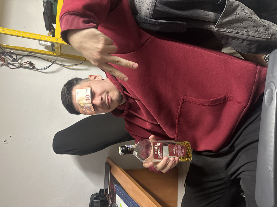 An adult male, estimated to be in his 20s or 30s, is depicted seated indoors, wearing a maroon hooded sweatshirt and dark trousers. A 10 Euro banknote is affixed horizontally to his forehead, obscuring his eyes. In his left hand, he holds a clear glass bottle labeled "HANKEY BANNISTER ORIGINAL BLENDED SCOTCH WHISKY" which contains an amber liquid. His right hand is raised, displaying a two-finger gesture commonly recognized as a "peace" or "victory" sign. He has short dark hair and a light mustache. The background features a plain, light-colored wall with minor imperfections. To the left, a portion of a wooden desk is visible, holding a black object, a smartphone, and glasses. A black office chair back is behind the subject. To the right, a yellow metal shelving unit is visible with numerous exposed wires draped over it. A dark grey garment with a repetitive pattern is draped over what appears to be an armrest to the subject's right. The specific location within Plovdiv, Bulgaria, cannot be determined from the visual information provided.