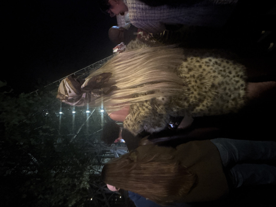 The image depicts a nighttime outdoor scene in Paris, France, likely within the Jardin des Tuileries, with a large illuminated metal structure resembling a Ferris wheel visible in the background. Several individuals are standing in what appears to be a crowd, viewed from behind. In the foreground, a person with long, blonde hair and a patterned brown and beige headscarf is wearing a full-length leopard print faux fur coat over a light-colored top. To their left, another person with long, dark brown hair is wearing a dark olive or brown long-sleeved top and blue jeans. Partially visible behind this person is another individual wearing a pink baseball cap. Between these two main figures, a person with dark, curly hair and a dark top is visible, possibly holding a mobile phone. To the right of the blonde-haired figure, another person with dark hair and glasses is seen on the far right, wearing a checkered or patterned top. Adjacent to them, a person with a dark head (possibly bald or wearing a dark cap) holds a clear plastic cup. The overall environment is dark, with ambient artificial light illuminating parts of the crowd and the large metal structure behind the trees.