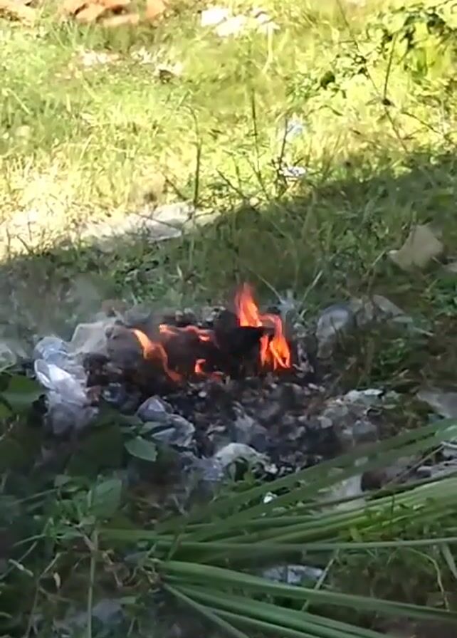 small fire burning in a grassy area. The fire is surrounded by plastic bags, some charred and some still intact. Smoke is rising from the fire. The grass around the fire is green and there are some weeds and other plants visible. In the background, there is a pile of bricks. There is no indication of people present.