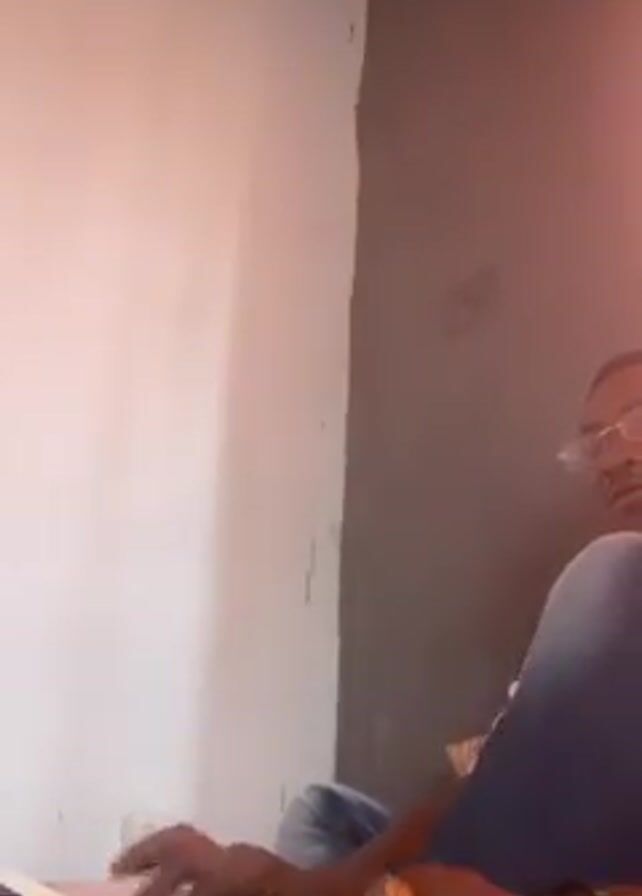 A man in glasses and jeans is sitting on the floor playing a keyboard. His right hand has a gold ring on it. Behind him is a wall with a light side and a dark side.