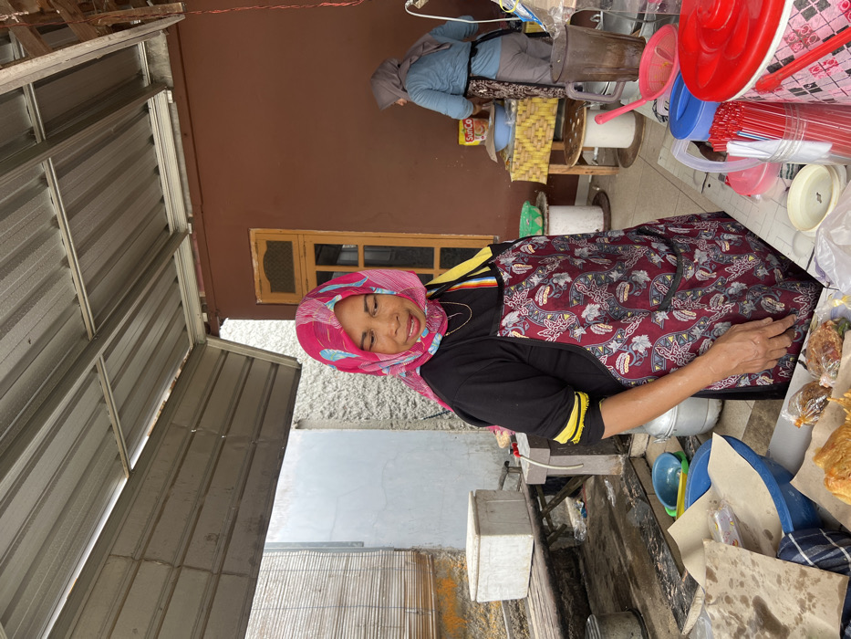 The scene depicts a semi-enclosed outdoor food preparation and vending area in Wedarijaksa, Indonesia