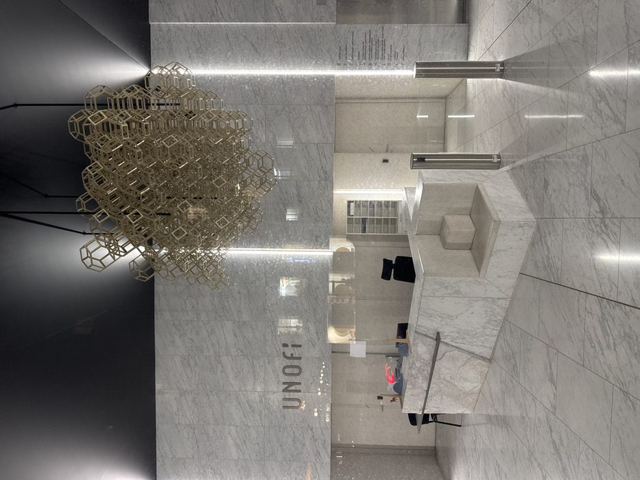 The image depicts the unoccupied reception area of UNOFI, located at 41-43 Avenue Kléber, 75116 Paris, France
