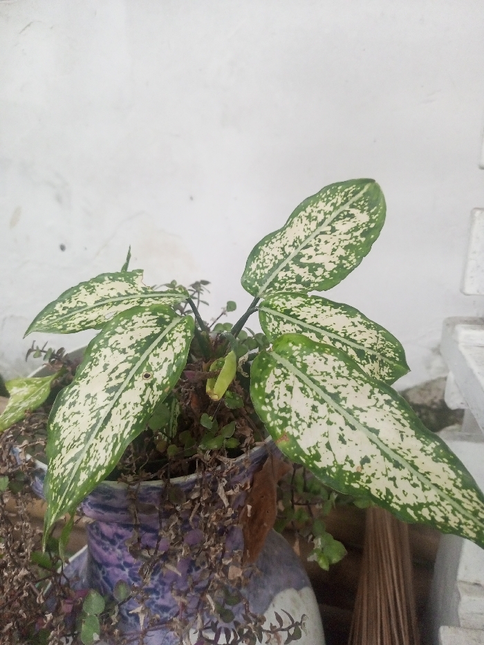 The image displays a potted plant situated in the city of Bamhori, India. The central subject is a variegated plant, likely an Aglaonema, featuring several broad, ovate leaves with prominent irregular white and cream speckles against a dark green base. At least five healthy leaves are visible, one exhibiting a small tear or hole on its left side. A smaller, pale green elongated growth is positioned centrally within the plant's foliage. The plant is contained within a rounded, vase-like pot constructed from ceramic or plastic, showcasing a marbled or swirled design in shades of purple and white. The pot's contents include a significant amount of dried, brown foliage, some of which hangs over the rim, interspersed with smaller, green trailing plant stems. The background consists of a plain, off-white wall with minor textural variations and discolorations. To the far right, a portion of a white, possibly concrete or painted wooden structure, such as a shelf or ledge, is visible, alongside a cluster of thin, brown, stick-like objects beneath the pot. No individuals or specific actions are depicted.