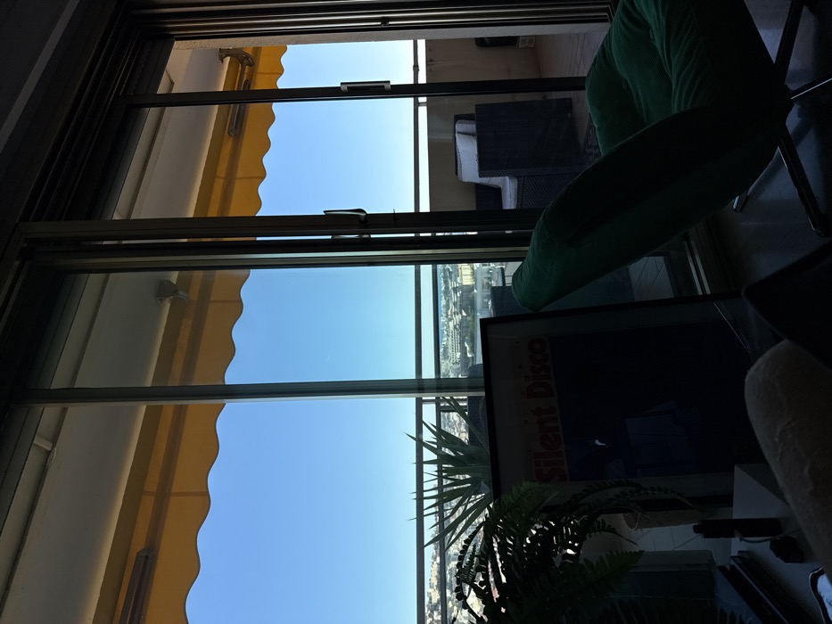 The image depicts an interior perspective looking out through a multi-panel glass sliding door onto a balcony and the cityscape of Cannes, France, under a clear blue sky. In the immediate foreground, to the left, is a dark green fern. Centered on the floor is a dark-framed poster, partially obscured by shadow, displaying the text "Silent Disco." To the right, a dark green, corduroy-textured armchair with a metallic base is oriented away from the glass door. A light-colored object is partially visible at the bottom center. Through the glass door, a balcony is visible. A bright yellow, scalloped awning extends above the balcony. On the balcony, to the left, a large, spiky succulent plant sits in a pot. To the right, a dark-colored outdoor armchair with a white cushion is present. A dark railing runs the width of the balcony. Beyond the balcony, the city of Cannes unfolds, characterized by numerous buildings and urban development under a bright, cloudless sky. A faint aircraft contrail is visible in the upper left sky. A distinct horizon line across the mid-distance reveals a body of water, likely the Mediterranean Sea, behind the city on the right side of the frame. The interior is significantly darker than the brightly lit exterior. No individuals are present.