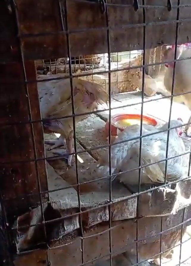 three-level wooden and wire cage with several white chickens inside. The cage appears old and weathered. In the bottom level, three chickens are visible, with one standing and two sitting near a red dish. The standing chicken appears to have sparse feathers on its back. On the upper levels, more chickens are visible, though details are obscured by the cage's wire mesh. The environment is generally dim.