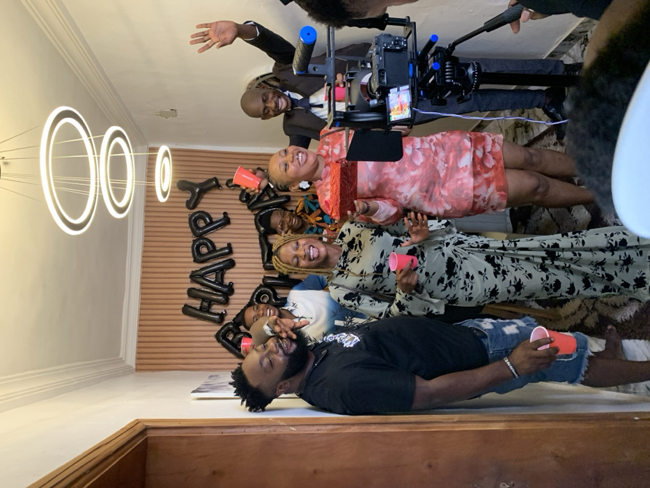 This image captures an indoor celebratory gathering in Ikorodu, Nigeria. Approximately nine individuals are present, predominantly smiling and laughing. The background wall features light-colored vertical slats adorned with black foil balloons spelling "HAPPY BIRTHDAY." Three illuminated circular LED pendant lights are suspended from the white ceiling. From left to right: A bearded man in a black t-shirt and ripped denim shorts holds a red plastic cup. Adjacent to him, a woman with blonde hair wears a long light green dress with a dark floral pattern, holding a pink plastic cup. A second woman, wearing a short pink and white floral dress, holds a red foil-wrapped gift box and a red plastic cup. To her right, a man in a dark suit jacket and tie smiles while raising his right hand in a wave. A professional video camera rig, mounted on a tripod and featuring an external monitor, is positioned to record the group, situated between the woman in the pink dress and the waving man. Other individuals are partially visible in the background, also smiling and holding red plastic cups. The head of a person operating the camera is visible in the immediate foreground on the right. The individuals' expressions and the decorations indicate a festive event, likely a birthday celebration.