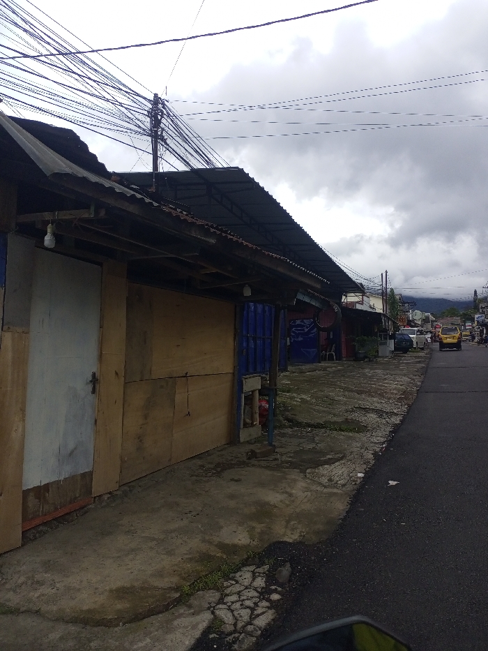 A street scene on a cloudy day features a row of weathered shops with makeshift facades. The structures are constructed from a mix of materials like wood panels and corrugated metal roofing. Above, a tangle of overhead wires dominates the sky. The asphalt street is freshly paved and wet, curving slightly towards the distant mountains in the background. A few vehicles are visible on the right side of the road.