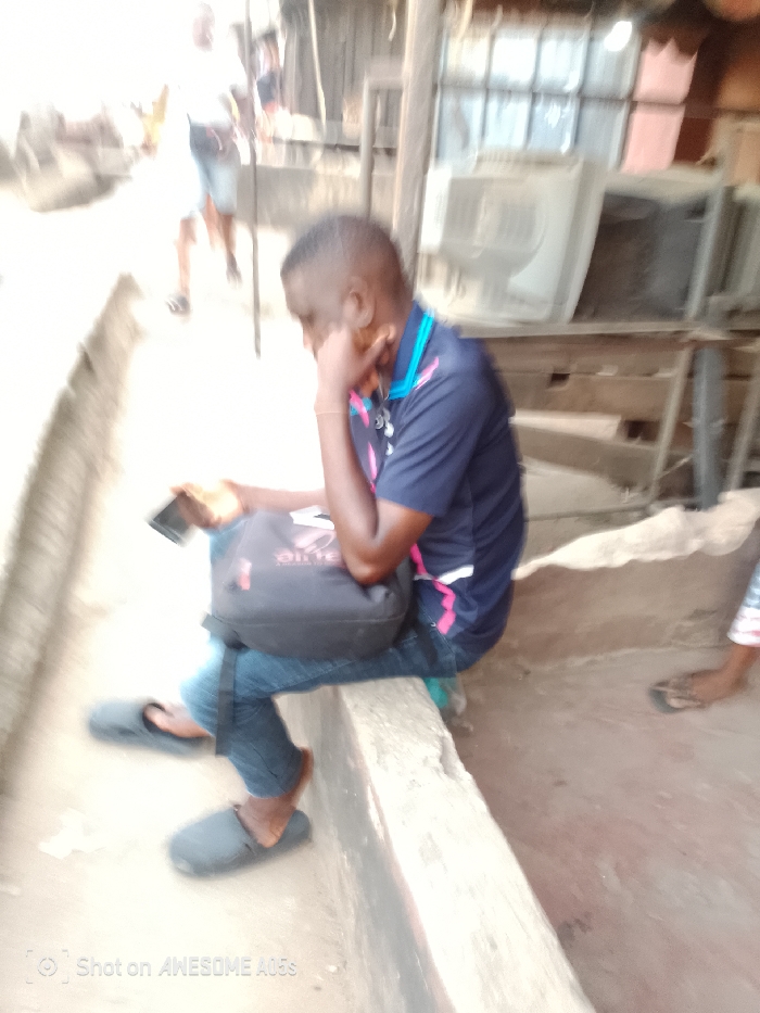 A man sits on a concrete ledge outdoors wearing blue jeans, a blue polo shirt with pink stripes, and dark slippers. He has a black bag slung across his body and holds a phone in his hand, his other hand resting on his face. In the background, another person walks away, and several old televisions are stacked on a wooden shelf. The photo is blurry.