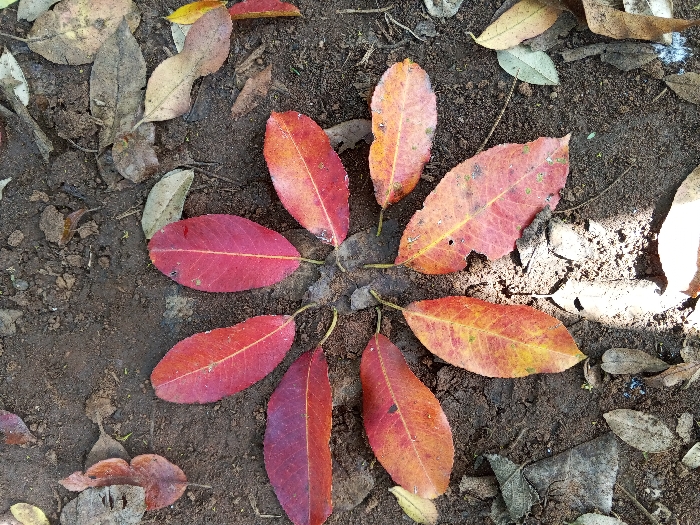 fallen leaves arranged in a circular pattern on dark brown soil