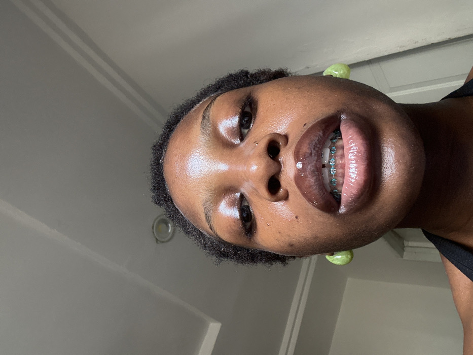 A close-up, low-angle indoor portrait depicts an individual with dark skin, short dark curly hair, and a direct gaze. The face, particularly the forehead, cheeks, and full lips, exhibits a glossy sheen. A small stud piercing is present on the subject's left nostril. The mouth is slightly open, revealing upper teeth fitted with blue orthodontic braces. Both ears feature large, light green hoop earrings. A black garment strap is visible at the bottom left. The background consists of a light-colored ceiling with a visible seam and a circular light fixture. A plain, light-colored wall or doorframe is partially visible to the left. The scene provides no specific visual markers to pinpoint a precise location within Abuja, Nigeria, beyond being an indoor setting.