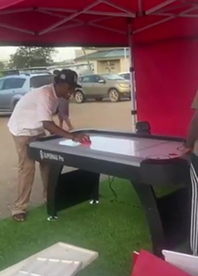 Two men are playing air hockey outdoors, under a red tent