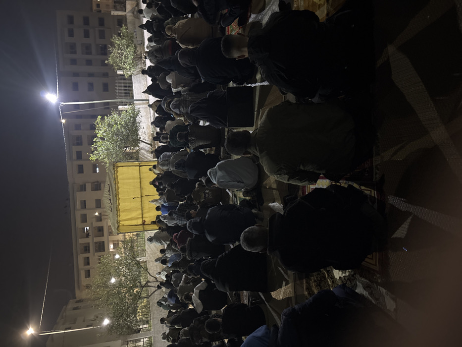The image captures an outdoor nocturnal gathering of approximately one hundred individuals, predominantly adults, seated on the ground in a public space in Fez, Morocco. The participants are uniformly oriented towards a central, yellow tent-like canopy structure situated at the front, which bears white Arabic script translating to "Mosque of the People of God." A microphone stand is visible in front of this canopy. Many individuals are seated on what appear to be prayer mats or blankets spread across the ground. The scene is illuminated by overhead streetlights, casting defined shadows. In the background, multi-story residential buildings are visible, interspersed with small trees and a low fence. Individuals are dressed in various modest garments, including hooded jackets and traditional attire, suggesting cooler evening temperatures.