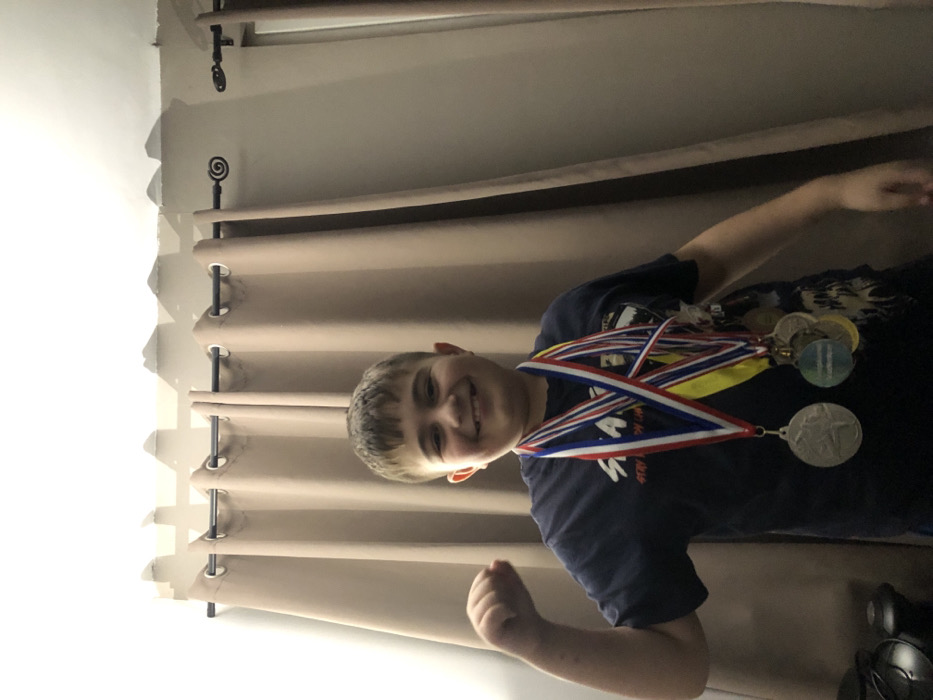 A smiling boy stands in front of a beige curtain, wearing a navy blue t-shirt and several medals. He has short brown hair. The medals around his neck have different colored ribbons with attached silver and gold discs. He is flexing his right arm with a clenched fist. A black curtain rod hangs behind him with decorative finials on the ends. Part of a black object is visible in the lower right corner.
