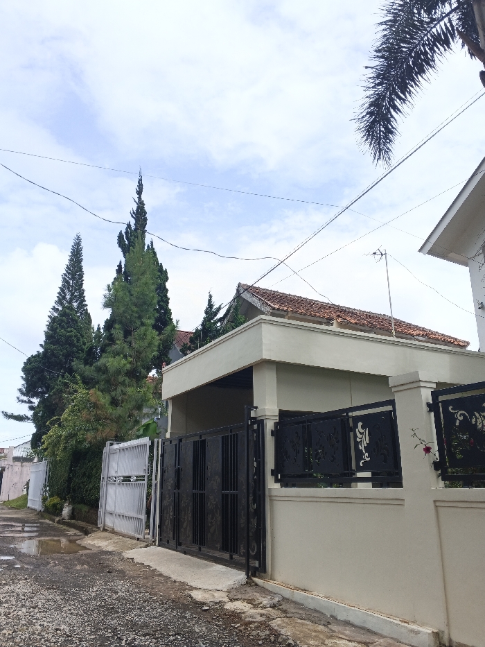 A tan wall and decorative black metal fence line the edge of a property next to an asphalt road. Behind the wall and fence is a small, one-story structure with a red tile roof. Tall evergreen trees stand to the left, reaching towards the sky with wispy clouds. A palm tree extends into the scene from the top right. Power lines cut across the sky.