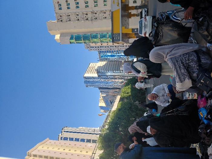 A group of people, including women wearing hijabs, are gathered on a street. Some are examining items on display, possibly for sale. Buildings line the street, creating a busy urban scene. The clear blue sky contrasts with the activity below. A car and what appears to be a wheelchair are also visible.