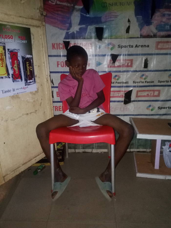 The image captures a young individual, likely male, seated on a red plastic chair indoors in the city of Unknown, Unknown
