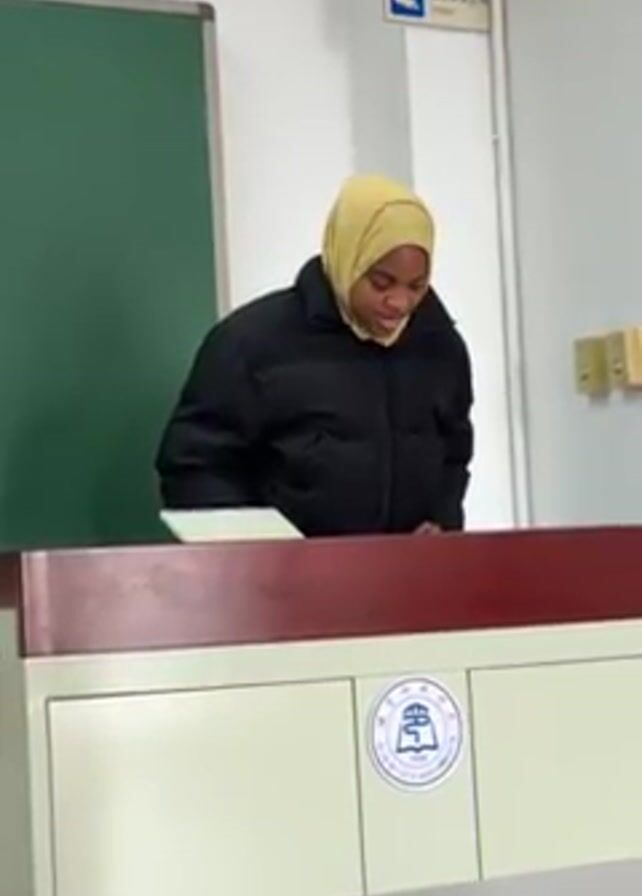 A person wearing a yellow hijab and a black puffer jacket stands behind a lectern in a classroom. They are reading from something on the lectern. The lectern is brown and beige, and has a logo on it. A green chalkboard is visible to the left. A sign is visible above the lectern on the wall.