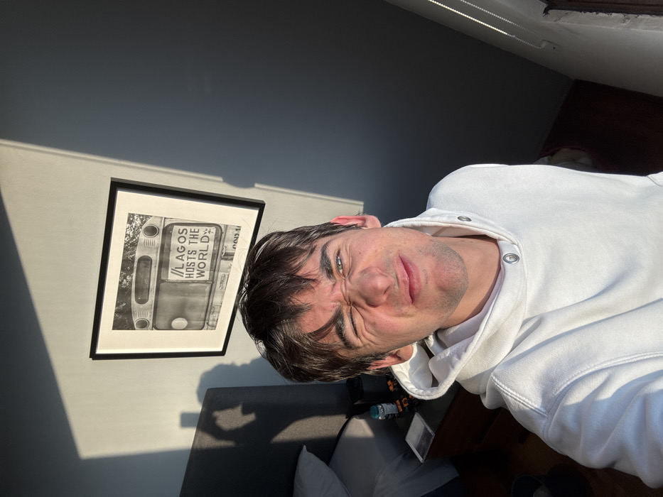 A man with dark hair and green eyes wears a white hoodie, looking directly at the camera with a slightly scrunched face. Behind him, on the wall, is a framed black and white print featuring a bus with the words "LAGOS HOSTS THE WORLD" on its side. Sunlight casts shadows across the gray wall and a corner of a sofa is visible below the print.