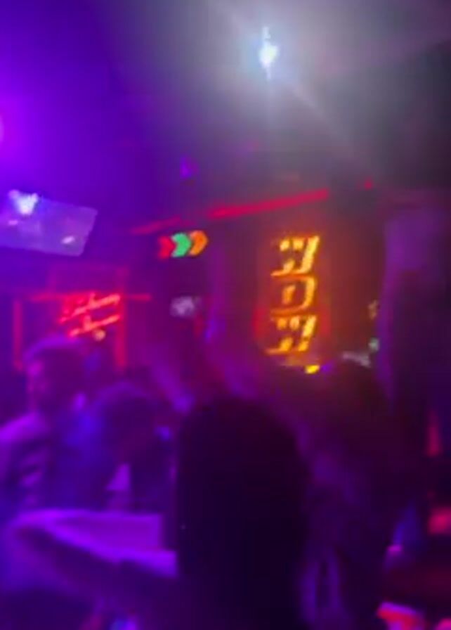 The video depicts a dimly lit interior, likely a nightclub or bar, with vibrant purple and red lighting