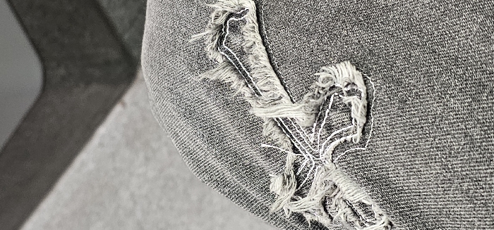 A close-up reveals a gray fabric, likely denim, featuring deliberately distressed elements