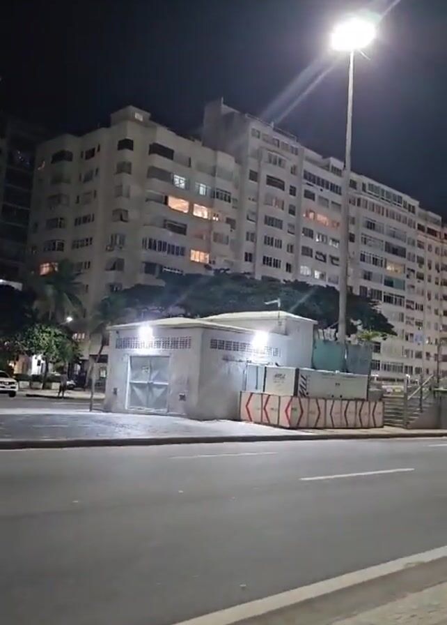 view from a moving vehicle at night, panning across a street scene. On the side of the road is a low white building with a fenced in area. Behind this building is a tall white apartment building with many windows, some of which are lit up. A tall streetlight illuminates the area. A pedestrian can be seen walking on the sidewalk. The sky is dark.