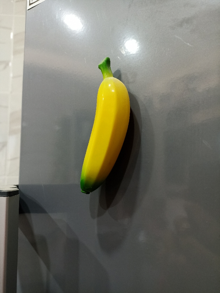 - "A glossy, banana-shaped refrigerator magnet is affixed to a dark grey, metallic surface, consistent with a refrigerator door" by FM-6eLZi2, licensed under CC BY 4.0