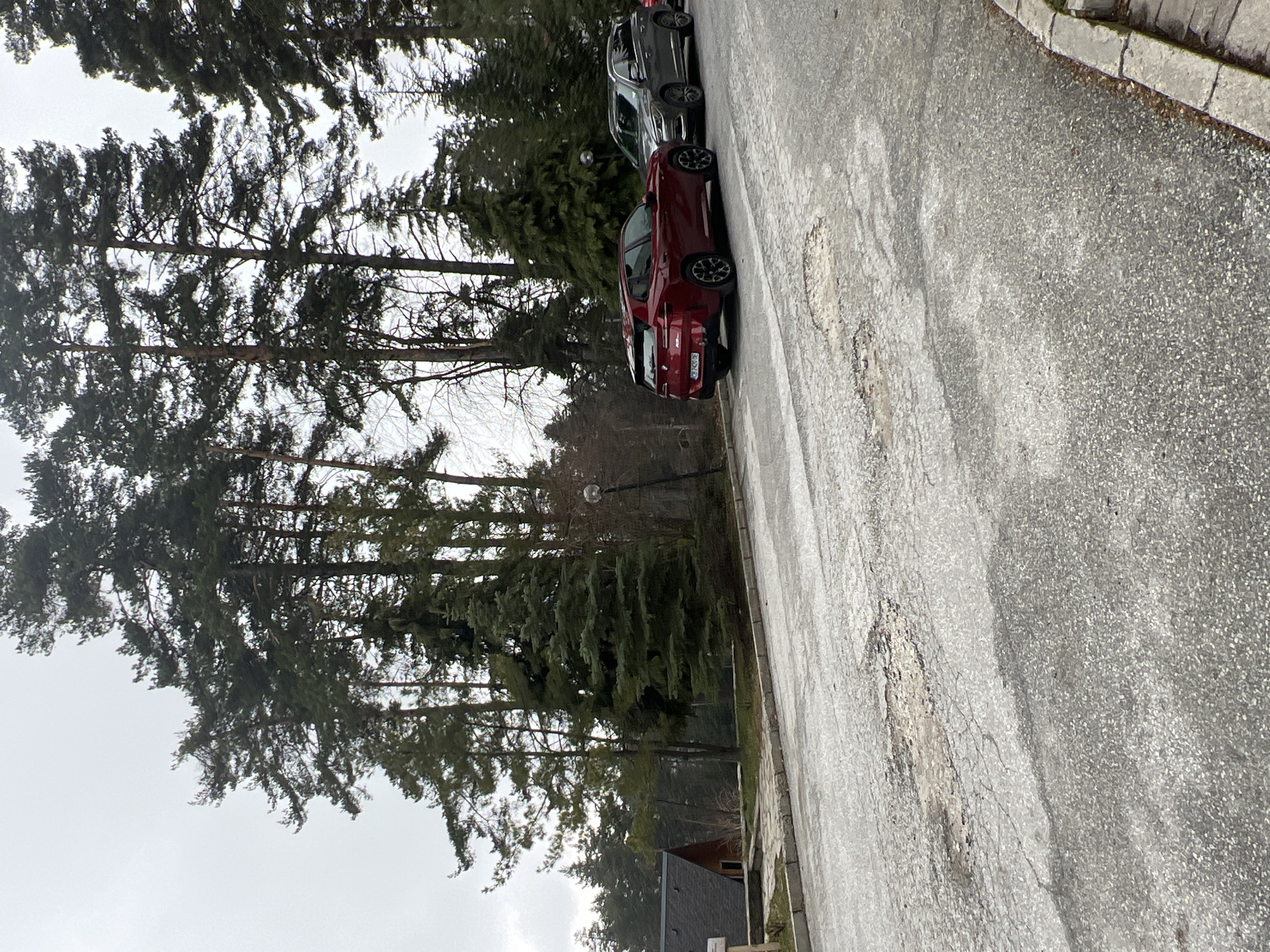 The image presents a street scene with two cars parked on the right side, near a curb. The closest car is red, and the one behind it is dark grey. The street surface appears to be asphalt with some visible wear or patching. Tall evergreen trees line the left side of the road, creating a heavily wooded area. There is a glimpse of a building roof amidst the trees on the left. The sky appears overcast. The image does not show any people. The provided location is Dedovo, Bulgaria.