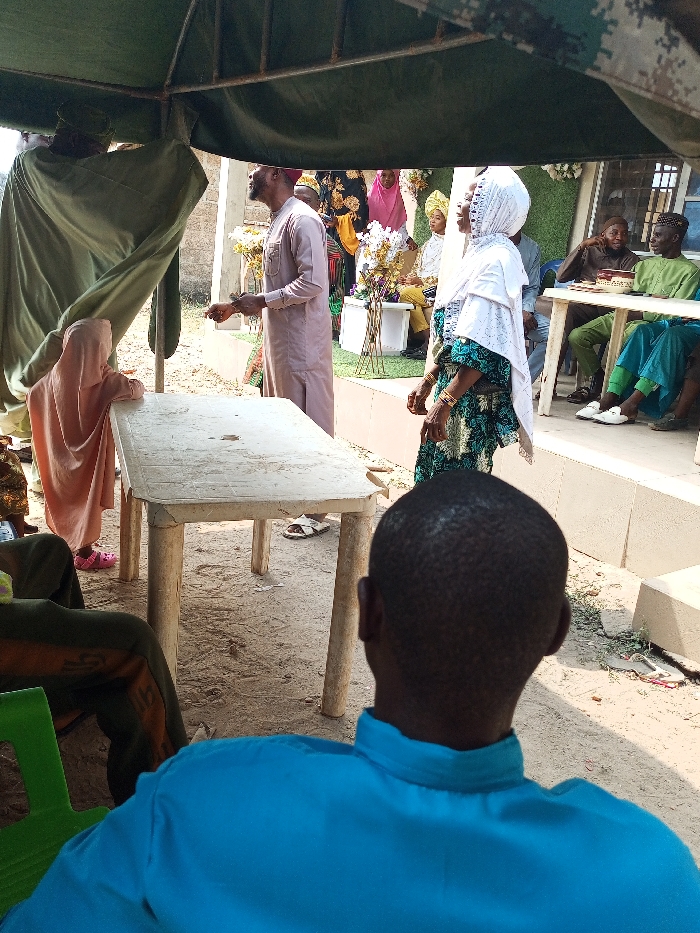This image captures an outdoor gathering under a green canopy structure in Erin-osun, Nigeria