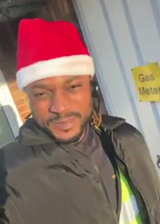 A man wearing a red Santa hat, black jacket, and a neon yellow safety vest with a black shirt underneath, is standing outside in front of a white wall with a "Gas Meter" sign. He has a nose piercing, a beard, and dreadlocks. He is wearing headphones and talking to the camera, wishing viewers a Merry Christmas. Visible breath indicates a cold outdoor temperature.