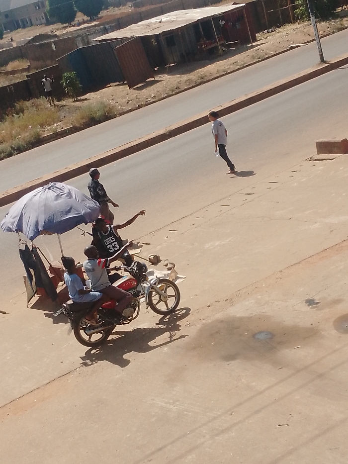 This image depicts an outdoor street scene in Sabon Tasha, Nigeria, under bright daylight conditions. In the left foreground, a red and white Qlink brand motorcycle is stationary or moving slowly on a paved surface. Attached to the motorcycle is a sidecar-like structure, partially obscured, covered by a large, light blue-grey umbrella providing shade. Three individuals are associated with this unit: * An adult male, wearing a grey shirt and dark trousers, is seated as the driver on the motorcycle. * Another adult male, wearing a black basketball jersey with "BULLS 33" visible on the front, is seated behind the driver. He has his right arm extended forward and slightly upward, gesturing or pointing. * A smaller individual, possibly a child, wearing a light blue shirt, is seated within the sidecar structure. Draped items, possibly clothing or fabrics for sale, hang from the sidecar structure. Small pieces of white debris and rocks are scattered on the ground near the motorcycle. Behind the motorcycle group, an adult male wearing a camouflage-patterned top and dark trousers walks towards the left side of the frame on the paved surface. In the right middle ground, an individual with light-colored hair, wearing a light-colored shirt and dark trousers, walks on the paved road, moving towards the left. This individual holds a white object, possibly a bottle, in their right hand. Strong shadows are cast on the ground from the people and objects, indicating a high sun angle. The main thoroughfare is a paved two-lane road with a raised brown curb separating it from a dirt or unpaved shoulder. In the background, beyond the shoulder, there is a row of single-story, rudimentary structures, some appearing to be repurposed shipping containers with numbers like '2' and '17' visible on their sides. Sparse, dry vegetation is present between the road and these structures. Further in the background, a larger, multi-story building is visible under a clear sky. A utility pole stands on the right side of the road in the background.