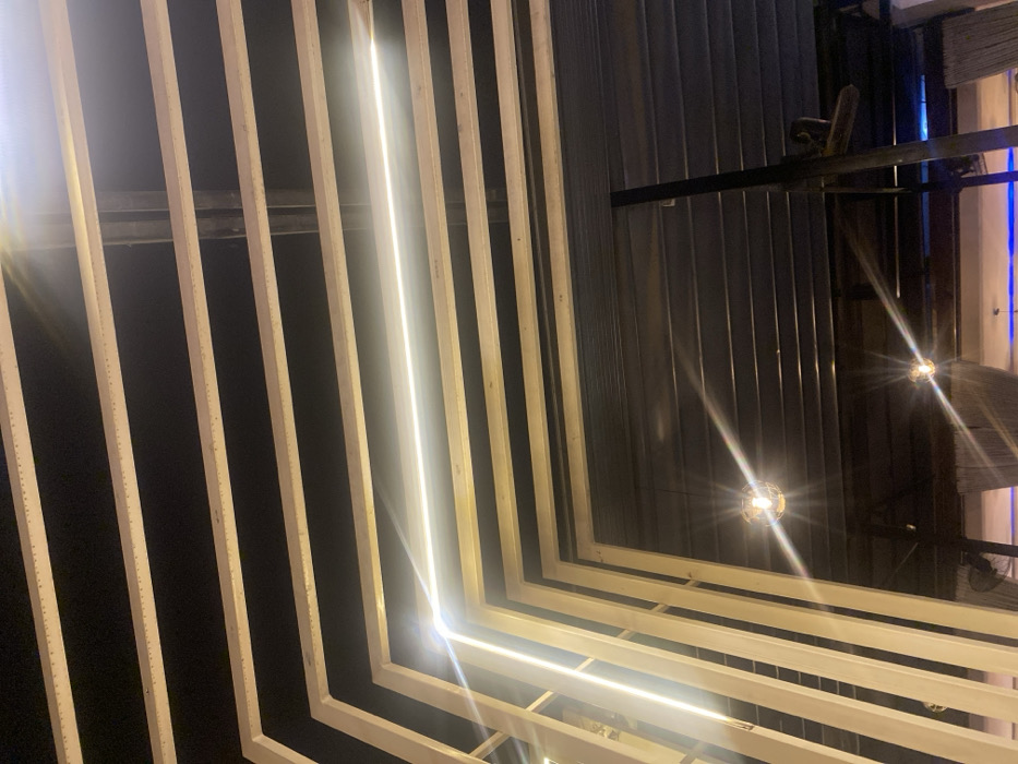 n upward view of a structure with repeating vertical and horizontal white slats that create a lattice-like pattern. A strip of bright white light runs along the edges of the structure. Beyond the slats is a darker, possibly metallic wall with vertical grooves. There are two visible light fixtures hanging from the structure, casting bright, star-like bursts of light.