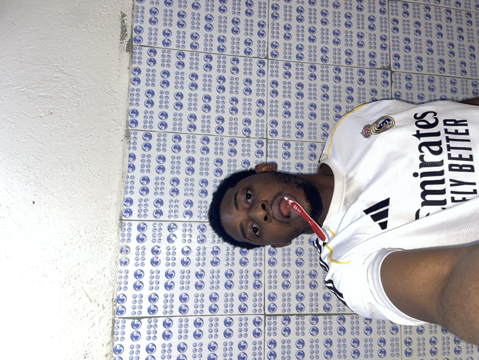 An adult male, with dark skin, short dark hair, and a trimmed beard, is depicted indoors in Akwanga, Nigeria. He is wearing a white short-sleeved football jersey, identifiable as a Real Madrid kit with the Adidas logo on the right chest, the club crest on the left chest, and "Emirates FLY BETTER" sponsor text across the torso. A red toothbrush, with white bristles and "Colgate" branding visible on the handle, is positioned horizontally in his mouth, resting on his extended tongue. The subject is looking directly into the camera. The background consists of a wall tiled with white square ceramic tiles featuring a repeating pattern of concentric blue circles and small blue dots. Above the tiled section, a textured, off-white ceiling or upper wall surface is visible.