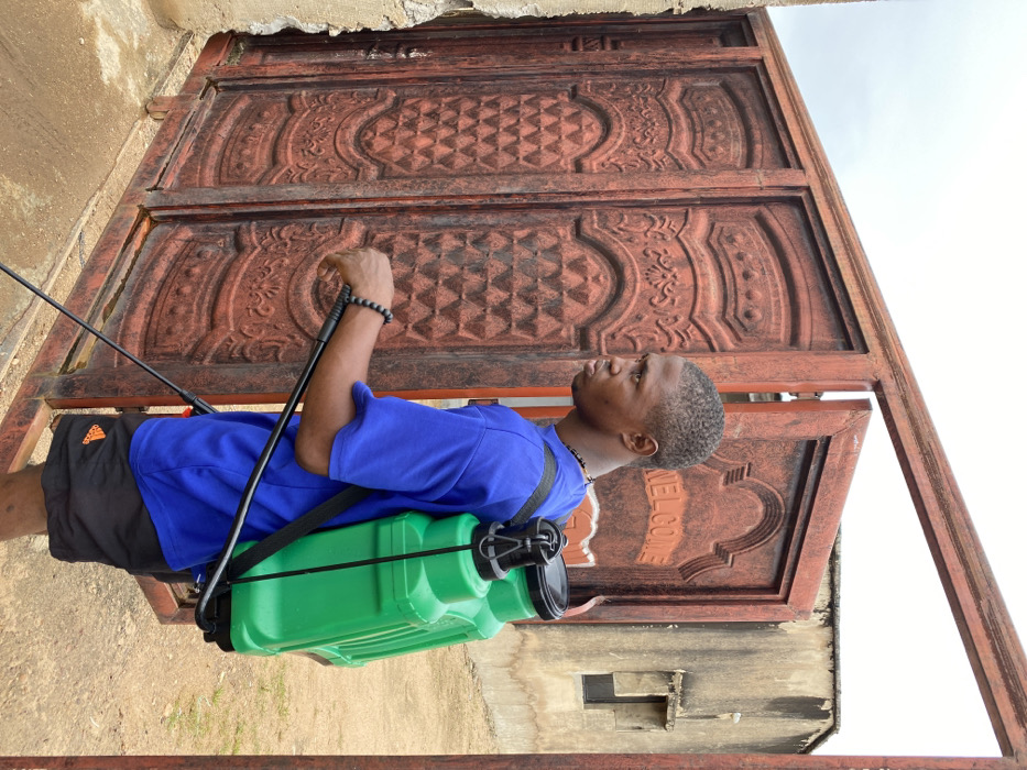 An adult male stands outdoors, facing right, in what is identified as Lokoja, Nigeria. He wears a blue t-shirt, black shorts with Adidas branding on the left leg, and a dark beaded bracelet on his left wrist. On his back, he carries a bright green manual pump sprayer with black straps and components. His left hand holds a black rod, likely part of the sprayer mechanism. He has short dark hair and a focused expression. Behind him is a large, ornate, double-leaf metal gate, rusty reddish-brown, featuring intricate geometric and scroll patterns. The right leaf of the gate bears the partially visible raised word "WELCOME." The gate is slightly ajar, revealing a section of a dilapidated building with stained, light-colored walls and a dark rectangular opening to the right. The ground beneath is light brown earth, and the sky is overcast.