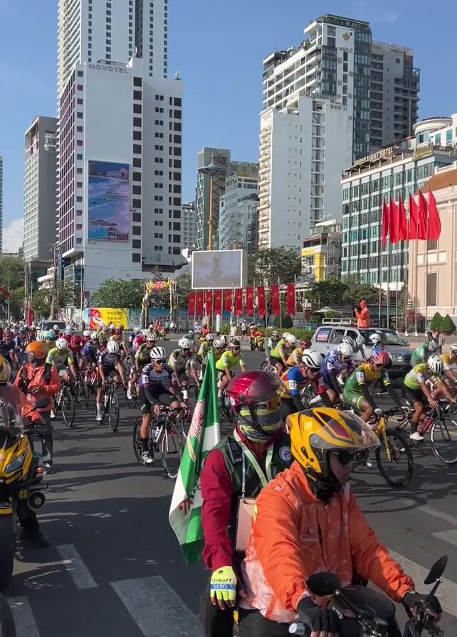 The video captures a large group of cyclists participating in a race through a city. They are riding on a wide street lined with tall buildings and palm trees under a clear blue sky. A few motorcycles with riders in orange jackets are positioned ahead of the cyclists, possibly for escort or security. One of the motorcycles has a passenger holding a green flag. The cyclists are wearing various team jerseys and helmets, and their bikes are racing bikes. There are numerous pedestrians observing the race from the sidewalks. Several red flags hang from buildings along the street, and a large screen displays an image or video.