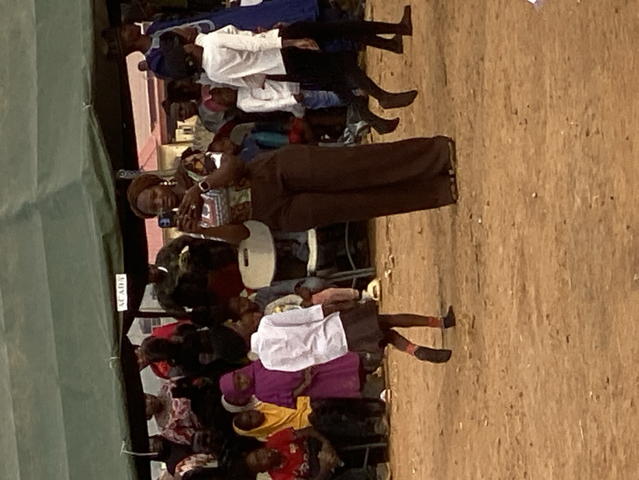 People sit under a tent, including adults and children. Some wear traditional clothing, while others wear modern attire. One woman stands out, holding a phone and seemingly taking a picture. A child with black shoes is on the right side of the image. The backdrop is a sandy ground. The camera angle is slightly tilted, emphasizing the diverse group gathered together.