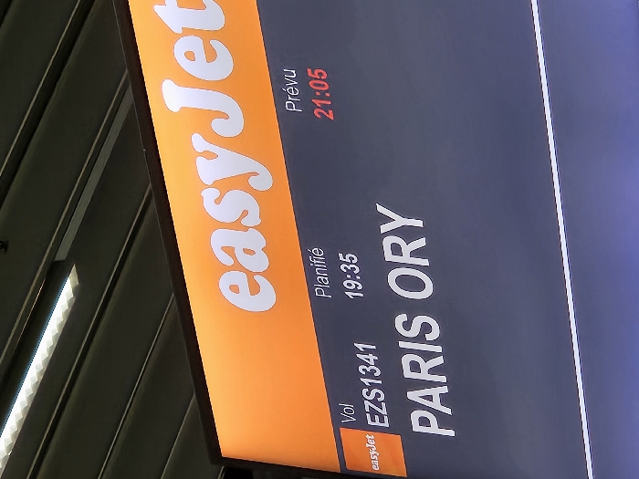 An illuminated digital display board, likely located within Geneva Airport (GVA) in Le Grand-Saconnex, Switzerland, occupies the majority of the frame. The upper section of the board features an orange background with the white "easyJet" logo prominently centered. Below this, against a dark gray background, white text details flight information. The left column shows a smaller "easyJet" logo followed by "Vol" and the flight number "EZS1341," indicating a flight to "PARIS ORY" (Paris Orly). The middle column displays "Planifié" (Scheduled) with a time of "19:35." The right column shows "Prévu" (Estimated) with the updated time "21:05" rendered in red text. Above the display board, parts of a dark gray ceiling structure are visible, featuring recessed, linear fluorescent light fixtures with a distinct textured or corrugated diffuser pattern. No people, specific actions, or interactions are visible in the scene. The environment is consistent with an indoor airport terminal setting.