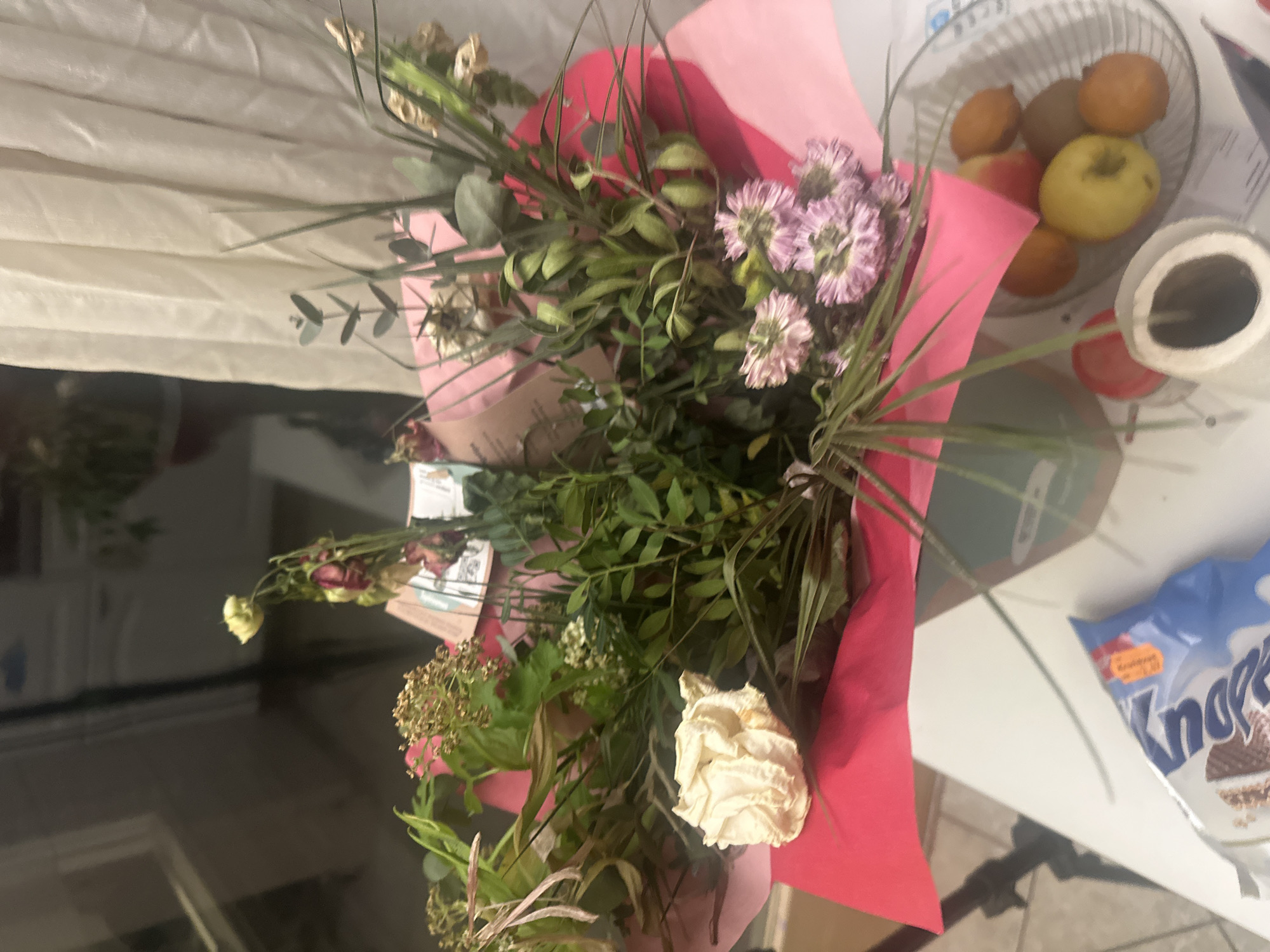 An indoor scene displays a large floral bouquet centrally positioned on a white table. The bouquet is wrapped in bright red and pink paper, containing various flowers and green foliage. Visible elements include a prominent dried, cream-colored rose in the lower-left, a cluster of dried pinkish-purple florets in the lower-right, and several other dried or wilting flowers and leaves, along with some still green foliage. Two small, rectangular cards are partially visible within the bouquet. In the background, a window or glass panel reflects an interior space on the left, while a cream-colored curtain covers the window on the right. On the white table surface in the foreground, to the left of the bouquet, a partially visible blue and white package, likely containing snack wafers, is present. To the right, a transparent glass bowl holds several fruits, including a yellow apple, oranges, and kiwis. Adjacent to the bowl, a white cylindrical object, possibly a roll of tape, stands upright next to a partial red circular object. The specific location in Geldrop, Netherlands, is undeterminable from the provided image.