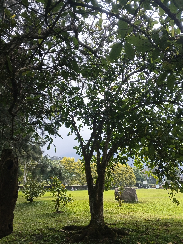 A lush green park features trees framing the scene. One tree is central with exposed roots and dense leaves. Other trees, some with yellow foliage, populate the background. A large rock rests on the grassy expanse. Part of a wooden structure with a hole in it is visible on the left. Distant figures appear to stroll along a path near a low wall or fence. The sky is overcast, creating soft light throughout.