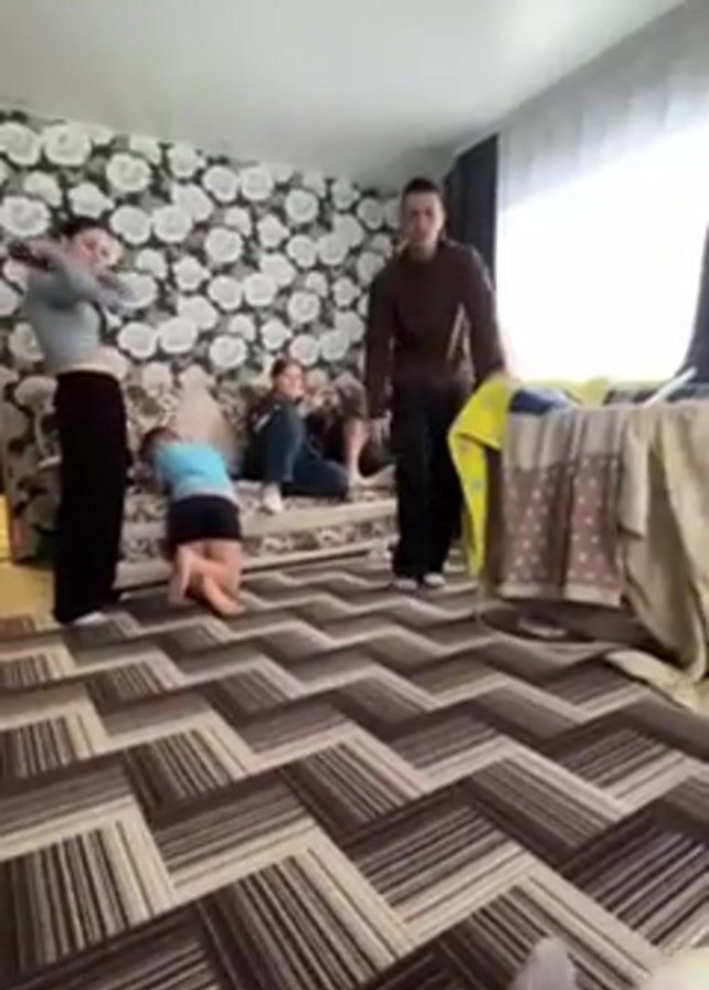room with a complex geometric patterned carpet. A person in light-colored socks is visible in the bottom right corner of the frame. Four young adults and one child are present. The child is on their hands and knees near the center of the room. One young adult stands nearby, appearing to encourage or direct the child. Three other young adults are sitting on a sofa against a wall covered in floral-patterned wallpaper. There is a colorful ball on the carpet in front of the child. A bed or couch partially covered with a yellow blanket is to the right of the frame, near a window.