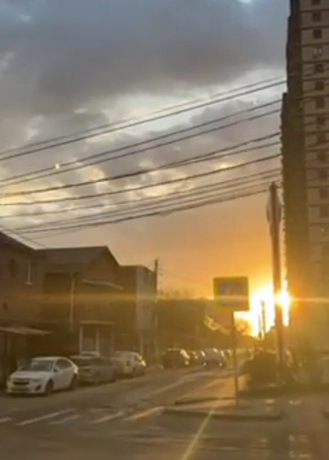 street scene at sunset. The sky is a mix of dark, ominous clouds and bright orange sunlight. The sun is low in the sky, casting a warm glow on the buildings and cars below. A crosswalk sign is visible in the foreground, and several cars are parked along the street. Power lines crisscross overhead. A tall apartment building is visible on the right side of the frame.