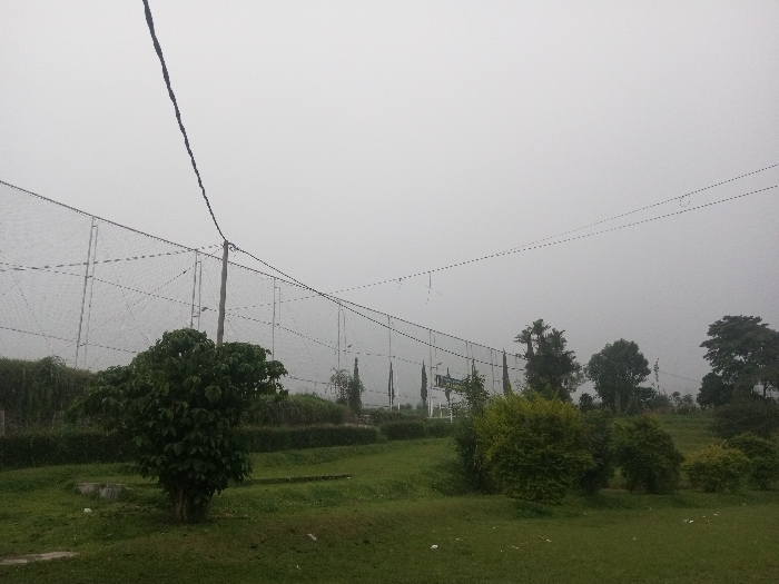 This image depicts an outdoor, landscaped area under an overcast, hazy sky in Ciherang, Indonesia. The scene is dominated by a large, dark-meshed net structure, supported by numerous light-colored poles, extending horizontally across the mid-ground, suggesting a sports facility such as a golf driving range. In the foreground, a prominent, dark green, leafy tree stands slightly left of center on a grassy slope. To its right, several smaller, dense green bushes are scattered across the uneven, grass-covered ground. A dark, thick electrical cable runs diagonally from the upper-left corner of the frame to a utility pole positioned behind the prominent tree, partially obscured. A thinner, segmented wire stretches horizontally across the upper mid-section of the image. A light-colored, flat, rectangular object is visible on the ground near the base of the prominent tree. Behind the netting, a line of manicured green hedges is visible, followed by various trees, including tall, slender, dark green conifers and broader, rounded trees with darker foliage. The background consists of a uniform, light grey, overcast sky, which merges with a distant, indistinct horizon line, where vague silhouettes of further trees or terrain can be perceived through atmospheric haze. There are no visible people, animals, or discernible actions occurring within the frame.