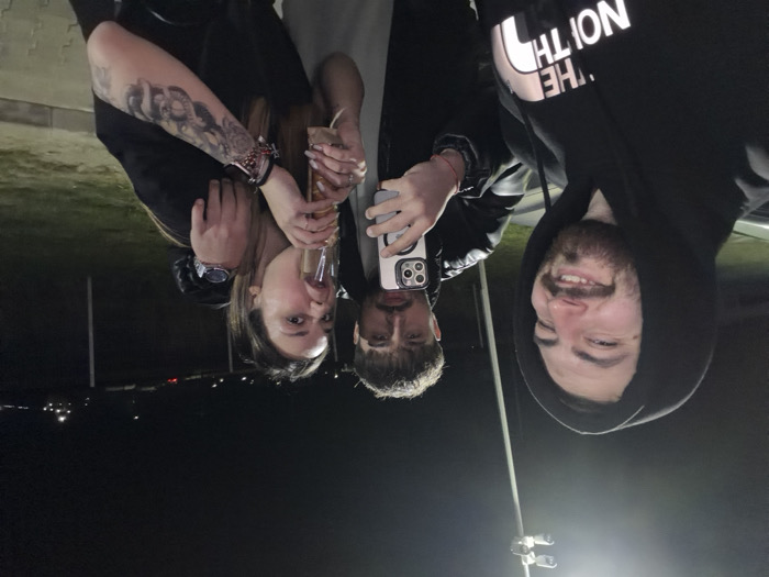 A night-time image captures three individuals outdoors in Frătești, Romania. On the left, a male with a beard and dark hooded sweatshirt featuring "THE NORTH FACE" logo is smiling and winking, seemingly taking a selfie. In the center, a second male with a mustache holds a silver-colored smartphone with a multi-lens camera system in his right hand. He has his left arm draped over the shoulder of the female on the right. This female, with dark hair pulled back, displays a heavily tattooed left arm, wears a watch, multiple bracelets, and a dark short-sleeved top. She is depicted drinking from a tall, clear glass or bottle, with her head tilted back and mouth open. The background is dark, illuminated by a prominent pole-mounted light fixture in the upper left of the frame. Distant lights and faint structures are visible further back, indicating an open, illuminated outdoor area, possibly a parking lot or roadside location.