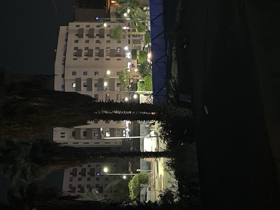 A dimly lit nighttime shot focuses on a tall building illuminated by streetlights. Palm trees frame the building, creating a contrast between the natural and urban environments. The foreground is dark, partially obscuring the view, while the background features the building's structure and surrounding greenery. A tall fence stands to the right of the building.