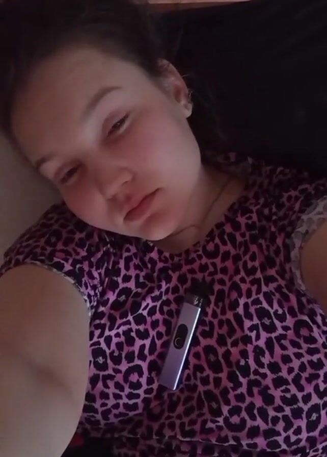 A woman is lying down wearing a pink and black leopard print shirt. There is a silver vape pen on her shirt. She is making a kissing face. The video is taken from a high angle, looking down at her.
