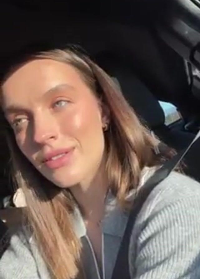 A young woman with light brown hair and blue eyes is sitting in the driver's seat of a car. She is wearing a grey collared shirt and a seatbelt. The car's sunroof is open, letting in bright sunlight. There is music playing in the background. She is looking at the camera and appears to be talking.