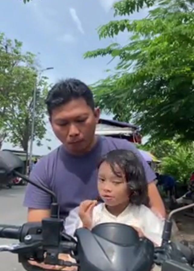 A low-angle medium shot captures a man and a young girl on a stationary motor scooter. The man, wearing a blue-purple T-shirt, is in the driver's seat and eating what appears to be a french fry. The girl, in a white top, is seated in front of him, holding her right hand up near her face. The scooter is black and silver, with a view of the handlebars and control panel. The backdrop includes a street scene with trees, a utility pole, other parked scooters, and some people in the distance. The sky is partially covered with white clouds, creating a bright, daytime scene.